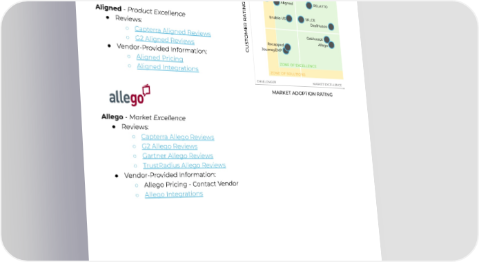 Digital Sales Room Software Vendors: (PresentedAlphabetically) Aligned-ProductExcellence ● Reviews: ○ CapterraAlignedReviews ○ G2AlignedReviews ● Vendor-ProvidedInformation: ○ AlignedPricing ○ AlignedIntegrations Allego - MarketExcellence ● Reviews: ○ CapterraAllegoReviews ○ G2AllegoReviews ○ GartnerAllegoReviews ○ TrustRadiusAllegoReviews ● Vendor-ProvidedInformation: ○ AllegoPricing-ContactVendor ○ AllegoIntegrations