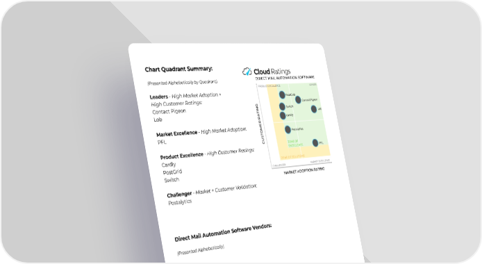 Chart Quadrant Summary: (Presented Alphabetically by Quadrant) Leaders-High Market Adoption + High Customer Ratings: Contact Pigeon Lob Market Excellence-High Market Adoption: PFL Product Excellence-High Customer Ratings: Cardly PostGrid Switch Challenger-Market + Customer Validation: Postalytics Direct Mail Automation Software Vendors: (Presented Alphabetically) Cardly - Product Excellence ● Reviews: ○ G2 Cardly Reviews ● Vendor-Provided Information: ○ Cardly Pricing ○ Cardly Integrations 2