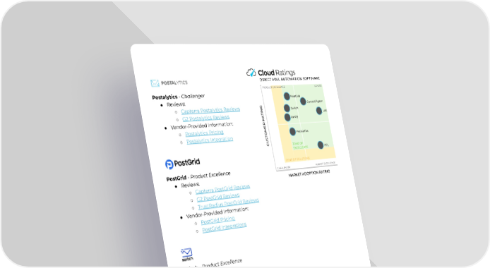 Postalytics - Challenger ● Reviews: ○ Capterra Postalytics Reviews ○ G2 Postalytics Reviews ● Vendor-Provided Information: ○ Postalytics Pricing ○ Postalytics Integration PostGrid-Product Excellence ● Reviews: ○ Capterra PostGrid Reviews ○ G2 PostGrid Reviews ○ TrustRadius PostGrid Reviews ● Vendor-Provided Information: ○ PostGrid Pricing ○ PostGrid Integrations Switch-Product Excellence ● Reviews: ○ Capterra Switch Reviews ○ G2 Switch Reviews ● Vendor-Provided Information: ○ Switch Pricing ○ Switch Integrations 4