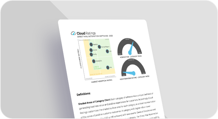 Definitions: Shaded Areas of Category Chart:Each category of softwarehas a unique likelihood of generating business value and positive experiences for customers. Accordingly, Cloud Ratings customizes the shaded surface area for each category as a visual representation of the zones of positive customer outcomes. A category with higher risk or lower satisfaction ratings (like ERP or HR software) will have smaller Zones of Excellence and Zones of Solutions than a safer, higher satisfaction category. For Direct Mail Automation Software, a normalized customer rating score of 4.60 (on a 5.00 scale) was used in setting the Zones’ surface area. Zone of Excellence (Light Green): This represents a category’s strongest vendors as reflected by their combination of market share and high customer satisfaction scores. Zone of Solutions (Light Yellow): Encompasses vendorswith both meaningful marketplace adoption and sufficiently high absolute customer satisfaction ratings. 6