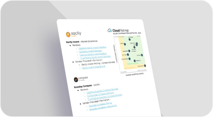 Xactly Incent - Market Excellence ● Reviews: ○ CapterraXactlyIncentReviews ○ G2XactlyIncentReviews ○ GartnerXactlyIncentReviews ○ TrustRadiusXactlyIncentReviews ● Vendor-ProvidedInformation: ○ XactlyIncentPricing-ContactVendor ○ XactlyIncentIntegrations XoxodayCompass-Leader ● Reviews: ○ CapterraXoxodayCompassReviews ○ G2XoxodayCompassReviews ○ TrustRadiusXoxodayCompassReviews ● Vendor-ProvidedInformation: ○ XoxodayCompassPricing ○ XoxodayCompassIntegrations 8