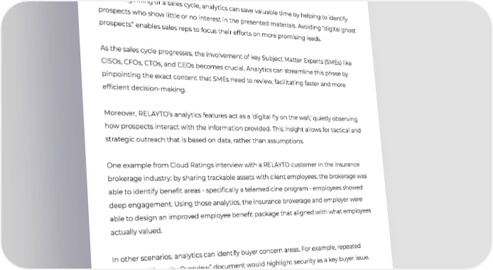 ROIDriver#4:SalesRepresentativeTimeSavingsViaAnalytics RELAYTO'sengagementanalyticsprovidereal-timeinsightsintohowusersinteractwith eachdocument,page,andassetintheDigitalSalesRoom. Atthebeginningofasalescycle,analyticscansavevaluabletimebyhelpingtoidentify prospectswhoshowlittleornointerestinthepresentedmaterials.Avoiding“digitalghost prospects”enablessalesrepstofocustheireffortsonmorepromisingleads. Asthesalescycleprogresses,theinvolvementofkeySubjectMatterExperts(SMEs)like CISOs,CFOs,CTOs,andCEOsbecomescrucial.Analyticscanstreamlinethisphaseby pinpointingtheexactcontentthatSMEsneedtoreview,facilitatingfasterandmore efficient decision-making. Moreover,RELAYTO’sanalyticsfeaturesactasa'digitalflyonthewall,'quietlyobserving howprospectsinteractwiththeinformationprovided.Thisinsightallowsfortacticaland strategic outreach that is based on data, rather than assumptions. OneexamplefromCloudRatingsinterviewwithaRELAYTOcustomerintheinsurance brokerageindustry:bysharingtrackableassetswithclientemployees,thebrokeragewas abletoidentifybenefitareas-specificallyatelemedicineprogram-employeesshowed deepengagement.Usingthoseanalytics,theinsurancebrokerageandemployerwere abletodesignanimprovedemployeebenefitpackagethatalignedwithwhatemployees actually valued. In other scenarios, analytics can identify buyer concern areas. For example, repeated opensofa“SecurityOverview”documentwouldhighlightsecurityasakeybuyerissue. 8