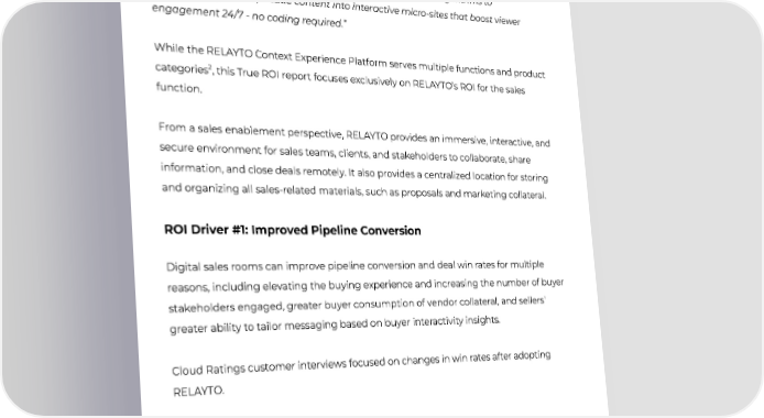 Solution Overview: RELAYTO’sOfficialDescription:“RELAYTOengagesadvancedalgorithmsto automaticallyrevampstaticcontentintointeractivemicro-sitesthatboostviewer engagement24/7-nocodingrequired.” WhiletheRELAYTOContextExperiencePlatformservesmultiplefunctionsandproduct 2 categories , this True ROI report focuses exclusively on RELAYTO’s ROI for the sales function. Fromasalesenablementperspective,RELAYTOprovidesanimmersive,interactive,and secureenvironmentforsalesteams,clients,andstakeholderstocollaborate,share information, and close deals remotely. It also provides a centralized location for storing andorganizingallsales-relatedmaterials,suchasproposalsandmarketingcollateral. ROIDriver#1:ImprovedPipelineConversion Digital sales rooms can improve pipeline conversion and deal win rates for multiple reasons, including elevating the buying experience and increasing the number of buyer stakeholdersengaged,greaterbuyerconsumptionofvendorcollateral,andsellers' greater ability to tailor messaging based on buyer interactivity insights. CloudRatingscustomerinterviewsfocusedonchangesinwinratesafteradopting RELAYTO. 2 SoftwarecategoriesservedbyRELAYTOinclude:ContentExperience,ContentDistribution,Content Analytics, Account BasedMarketing,Flipbook,Presentation,ContentCreation,Proposal,SalesEnablement, andDigitalSalesRoom 2
