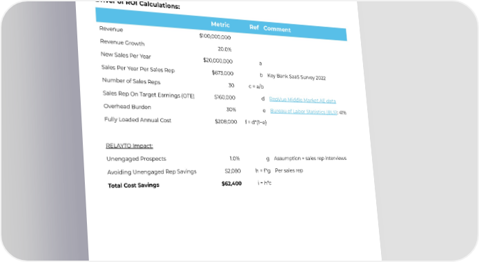 Formodelingthesetimesavings,CloudRatingsassumed1.0%ofallSQLsshow minimal-to-zerocontentengagementandarethereforeavoided.Accountexecutives referred to these unengagedprospectsas“ghosts”inCloudRatingsresearchinterviews to set this assumption. Driver of ROI Calculations: Metric Ref Comment Revenue $100,000,000 RevenueGrowth 20.0% NewSalesPerYear $20,000,000 a Sales Per Year Per Sales Rep $673,000 b KeyBankSaaSSurvey2022 NumberofSalesReps 30 c=a/b Sales RepOnTargetEarnings(OTE) $160,000 d RepVueMiddleMarketAEdata OverheadBurden 30% e BureauofLaborStatistics(BLS):41% Fully LoadedAnnualCost $208,000 f = d*(1+e) RELAYTOImpact: UnengagedProspects 1.0% g Assumption+salesrepinterviews AvoidingUnengagedRepSavings $2,080 h=f*g Persalesrep Total Cost Savings $62,400 i = h*c 9