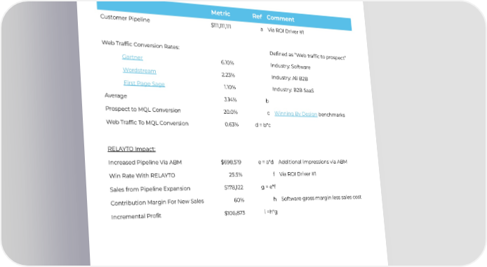 Forconservatism,thisTrueROImodelspipelineexpansiontreatingnewRELAYTO contentviewerslikegeneralwebsitetrafficinthefollowingROIcalculations: Driver of ROI Calculations: Metric Ref Comment CustomerPipeline $111,111,111 a ViaROIDriver#1 WebTrafficConversionRates: Definedas“Webtraffictoprospect” Gartner 6.10% Industry: Software Wordstream 2.23% Industry: All B2B First Page Sage 1.10% Industry: B2B SaaS Average 3.14% b ProspecttoMQLConversion 20.0% c WinningByDesignbenchmarks WebTrafficToMQLConversion 0.63% d=b*c RELAYTOImpact: IncreasedPipelineViaABM $698,519 e=a*d AdditionalimpressionsviaABM WinRateWithRELAYTO 25.5% f Via ROIDriver#1 Sales fromPipelineExpansion $178,122 g=e*f ContributionMarginForNewSales 60% h Softwaregrossmarginlesssalescost IncrementalProfit $106,873 i =h*g 7
