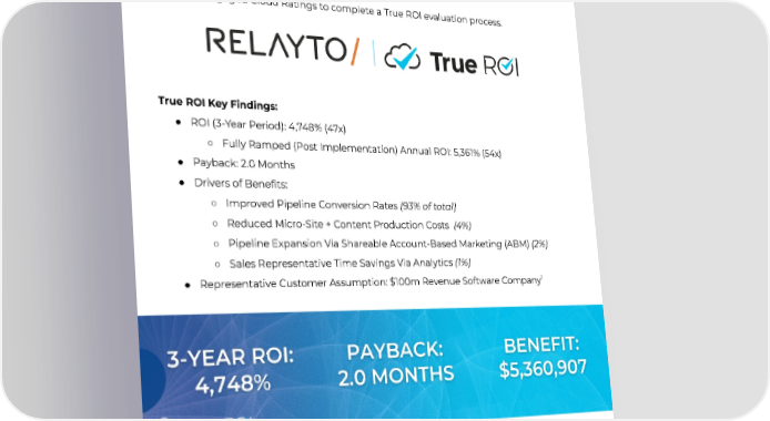 ExecutiveSummary: CloudRatingsTrueROIReportsquantifyandprovide3rdpartyvalidationofasoftware product’s business value. RELAYTOengagedCloudRatingstocompleteaTrueROIevaluationprocess. TrueROIKeyFindings: ● ROI(3-YearPeriod):4,748%(47x) ○ FullyRamped(PostImplementation)AnnualROI:5,361%(54x) ● Payback:2.0Months ● DriversofBenefits: ○ ImprovedPipelineConversionRates(93%oftotal) ○ ReducedMicro-Site+ContentProductionCosts (4%) ○ PipelineExpansionViaShareableAccount-BasedMarketing(ABM)(2%) ○ SalesRepresentativeTimeSavingsViaAnalytics(1%) 1 ● RepresentativeCustomerAssumption:$100mRevenueSoftwareCompany 1 Seereportsection“ROIAtOtherCustomerSizes”foralternativeROImodelreturns: - $25mRevenuewithLowerMargins:1,653%(17x)3-YearROI - $50mRevenuewithLowerMargins:3,299%(33x)3-YearROI 1