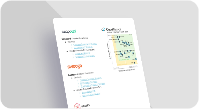Swapcard-MarketExcellence ● Reviews: ○ CapterraSwapcardReviews ○ G2SwapcardReviews ● Vendor-ProvidedInformation: ○ SwapcardPricing ○ SwapcardIntegrations Swoogo-ProductExcellence ● Reviews: ○ CapterraSwoogoReviews ○ G2SwoogoReviews ○ TrustRadiusSwoogoReviews ● Vendor-ProvidedInformation: ○ SwoogoPricing ○ SwoogoIntegrations vFairs - Leader ● Reviews: ○ CapterravFairsReviews ○ G2vFairsReviews ○ GartnervFairsReviews ○ TrustRadiusvFairsReviews ● Vendor-ProvidedInformation: ○ vFairsPricing ○ vFairsIntegrations 8