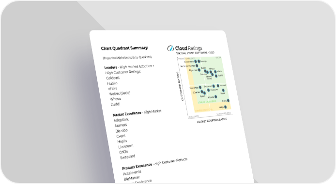 ChartQuadrantSummary: (PresentedAlphabeticallybyQuadrant) Leaders-HighMarketAdoption+ HighCustomerRatings: Goldcast Hubilo vFairs Webex(Socio) Whova Zuddl MarketExcellence-HighMarket Adoption: Airmeet Bizzabo Cvent Hopin Livestorm ON24 Swapcard ProductExcellence-HighCustomerRatings: Accelevents BigMarker RemoConference Swoogo Challenger-Market+CustomerValidation: 6Connex EventMobi Splash 2
