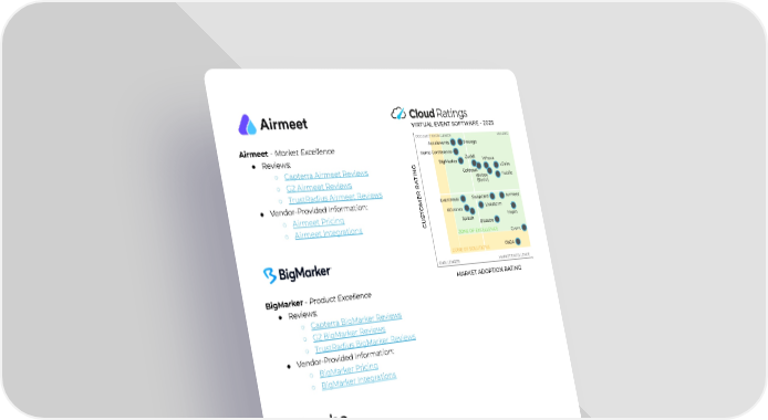 Airmeet-MarketExcellence ● Reviews: ○ CapterraAirmeetReviews ○ G2AirmeetReviews ○ TrustRadiusAirmeetReviews ● Vendor-ProvidedInformation: ○ AirmeetPricing ○ AirmeetIntegrations BigMarker-ProductExcellence ● Reviews: ○ CapterraBigMarkerReviews ○ G2BigMarkerReviews ○ TrustRadiusBigMarkerReviews ● Vendor-ProvidedInformation: ○ BigMarkerPricing ○ BigMarkerIntegrations Bizzabo-MarketExcellence ● Reviews: ○ CapterraBizzaboReviews ○ G2BizzaboReviews ○ GartnerBizzaboReviews ○ TrustRadiusBizzaboReviews ● Vendor-ProvidedInformation: ○ BizzaboPricing-ContactVendor ○ BizzaboIntegrations 4