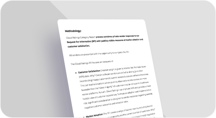 Methodology: CloudRatingsCategoryReportprocesscombinesprivatevendorresponsestoour RequestForInformation(RFI)withpubliclyvisiblemeasuresofmarketadoptionand customersatisfaction. All vendors are presented with the opportunity to complete the RFI. TheCloudRatingsRFIfocusesonmeasuresof: ● CustomerSatisfaction:GreatestweightisgiventointernalNetPromoterScore (NPS)data.Why?Certainsoftwarevendorsareskilledatdriving(andoften incentivizing) happy customers to submit reviews to popular software directories. This can lead to situations where publicly observable vendor reviews are more favorable than the “silent majority” of customers that do not submit to software reviewplatforms.Assuch,CloudRatings’useofprivateNPSdataprovidesamore holistic view of customer experiences. To measure adoption and implementation risk, significant consideration is also given to vendor responses regarding severely negativecustomeroutcomesandretentionrates. ● MarketAdoption:TheRFIcoversarangeoftractionmetrics,includingbutnot limited to revenue, revenue growth, and the current number of customers. Why? Vendorscanappeartohaveanartificiallyhighmarketsharethroughaggressive marketingspend,publicrelations,andskillfulsolicitationofreviewstosoftware directories. Accordingly, Cloud Ratings’ use of RFI-derived information helps provide softwarebuyerswithamorerealisticviewofmarketadoption. 10