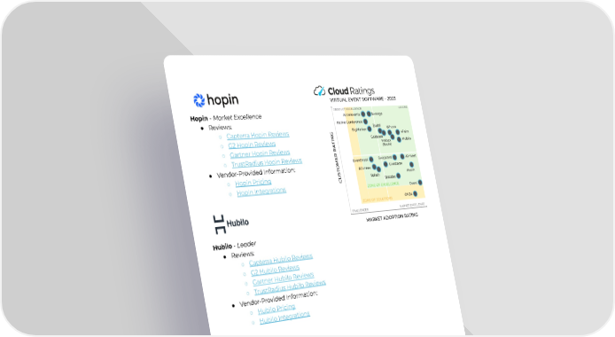 Hopin-MarketExcellence ● Reviews: ○ CapterraHopinReviews ○ G2HopinReviews ○ GartnerHopinReviews ○ TrustRadiusHopinReviews ● Vendor-ProvidedInformation: ○ HopinPricing ○ HopinIntegrations Hubilo-Leader ● Reviews: ○ CapterraHubiloReviews ○ G2HubiloReviews ○ GartnerHubiloReviews ○ TrustRadiusHubiloReviews ● Vendor-ProvidedInformation: ○ HubiloPricing ○ HubiloIntegrations Livestorm-MarketExcellence ● Reviews: ○ CapterraLivestormReviews ○ G2LivestormReviews ○ GartnerLivestormReviews ○ TrustRadiusLivestormReviews ● Vendor-ProvidedInformation: ○ LivestormPricing ○ LivestormIntegrations 6