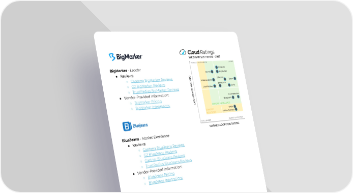 BigMarker-Leader ● Reviews: ○ CapterraBigMarkerReviews ○ G2BigMarkerReviews ○ TrustRadiusBigMarkerReviews ● Vendor-ProvidedInformation: ○ BigMarkerPricing ○ BigMarkerIntegrations BlueJeans-MarketExcellence ● Reviews: ○ CapterraBlueJeansReviews ○ G2BlueJeansReviews ○ GartnerBlueJeansReviews ○ TrustRadiusBlueJeansReviews ● Vendor-ProvidedInformation: ○ BlueJeansPricing ○ BlueJeansIntegrations Demio-ProductExcellence ● Reviews: ○ CapterraDemioReviews ○ G2DemioReviews ○ TrustRadiusDemioReviews ● Vendor-ProvidedInformation: ○ DemioPricing ○ DemioIntegrations 4