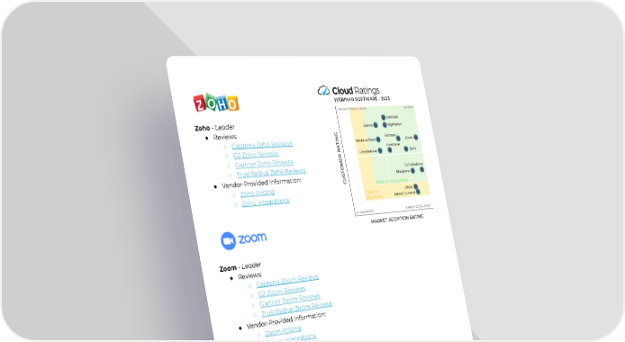 Zoho-Leader ● Reviews: ○ CapterraZohoReviews ○ G2ZohoReviews ○ GartnerZohoReviews ○ TrustRadiusZohoReviews ● Vendor-ProvidedInformation: ○ ZohoPricing ○ ZohoIntegrations Zoom-Leader ● Reviews: ○ CapterraZoomReviews ○ G2ZoomReviews ○ GartnerZoomReviews ○ TrustRadiusZoomReviews ● Vendor-ProvidedInformation: ○ ZoomPricing ○ ZoomIntegrations 7